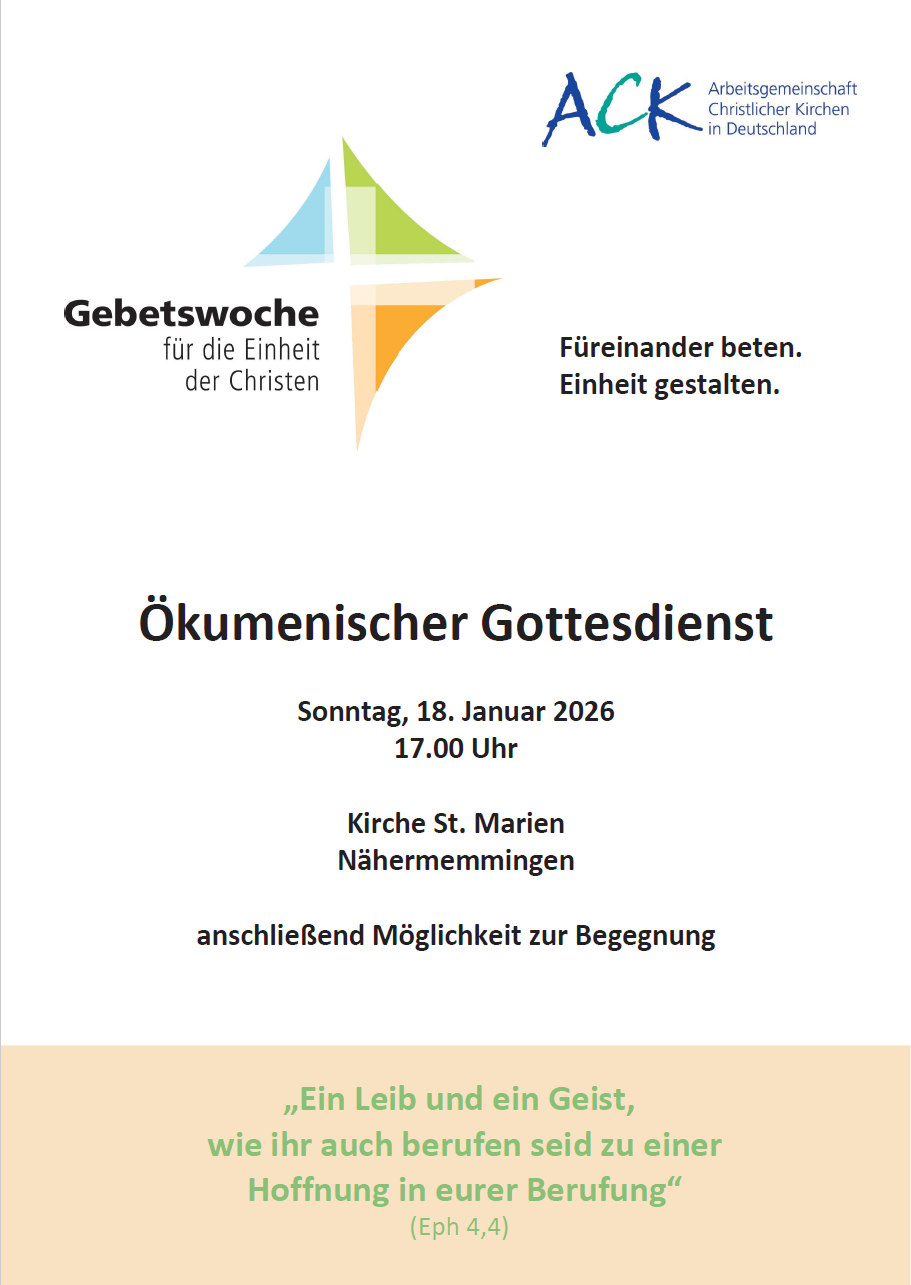 Dieses mal als ökumenischer Gottesdienst zur Feier des Beginns der Gebetswoche für die Einheit der Christen. Auf euer Kommen freuen sich Pfarrerin Marie-Christin Heider und Kaplan Jerome Muyunga.